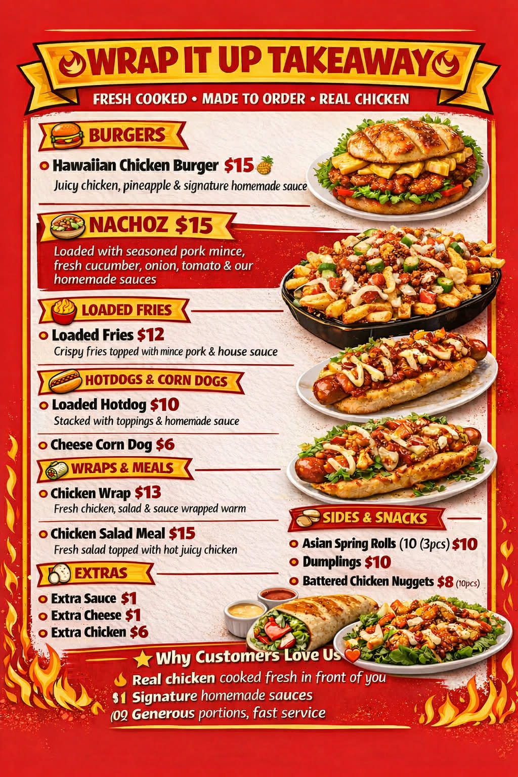 Wrap It Up Takeaway is a fresh-made, made-to-order takeaway joint serving real chicken and hearty comfort food. The menu spans chicken burgers, loaded nachos, crispy fries, hotdogs, wraps, and salad meals, with prices ranging from $6 to $15. Known for generous portions, $1 homemade sauces, and chicken cooked fresh in front of customers, it’s a no-fuss spot for quick, satisfying meals with a casual street-food feel.